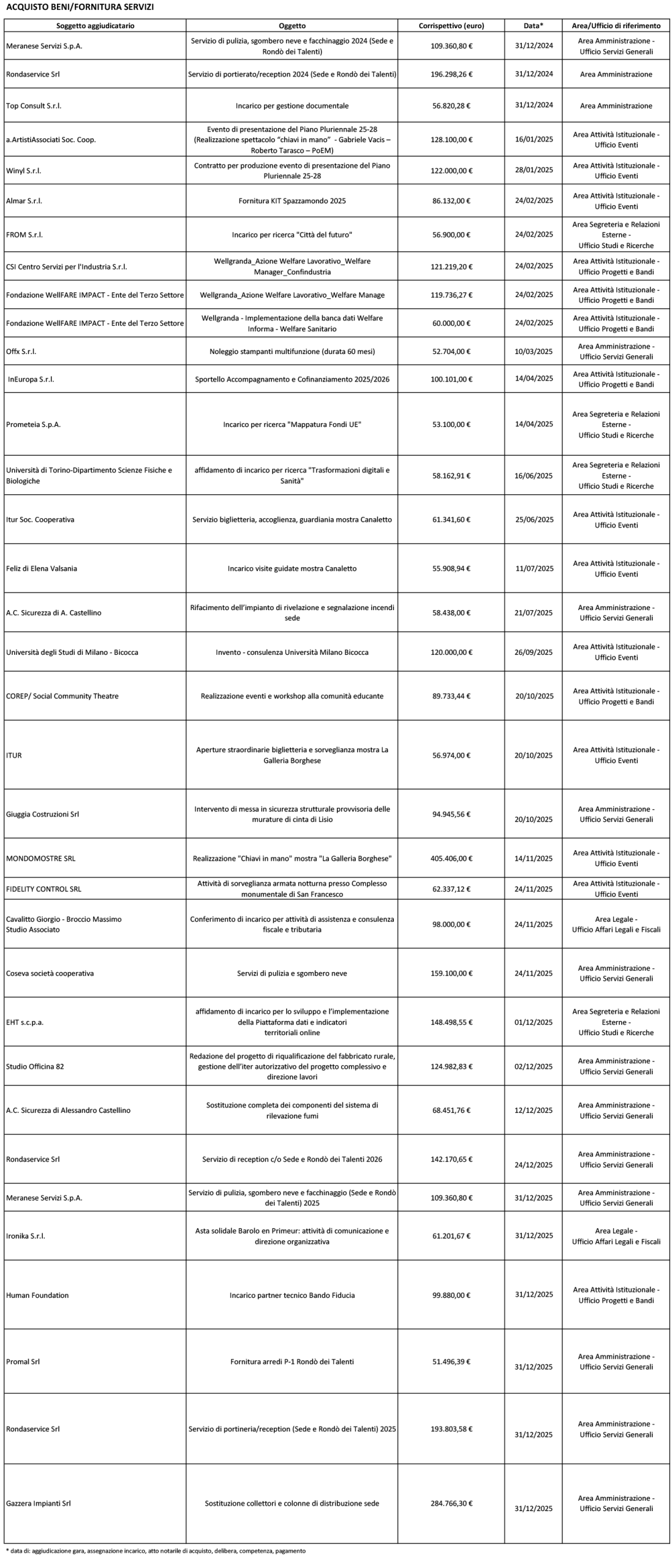 - le informazioni relative alle succitate forniture vengono rese pubbliche dopo che i relativi affidamenti sono stati effettuati, ad eccezione delle forniture che prevedono un costo orario per le quali la spesa totale viene pubblicata con l’approvazione del Bilancio;